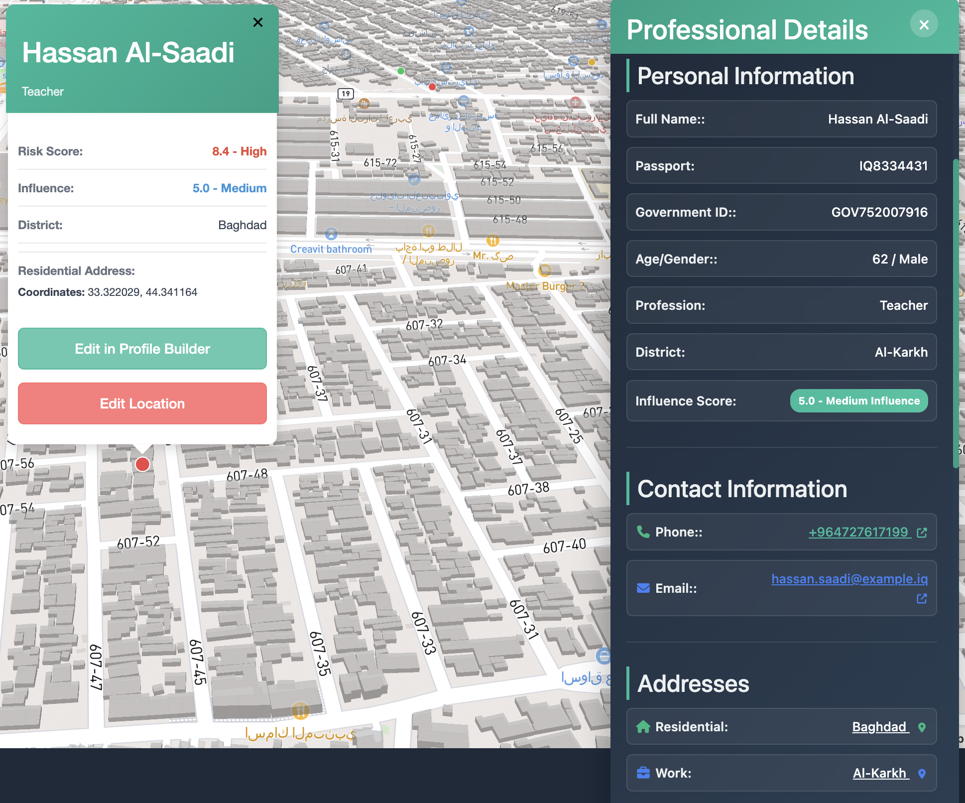 The platform aggregates and correlates data from authorized sources, including open-source intelligence and institutional datasets provided by national and governmental partners. This information is structured into unified profiles, allowing users to examine individuals and entities in detail including identity attributes, professional background, known associations, contact metadata, and location-based records such as primary and secondary addresses, where permitted.