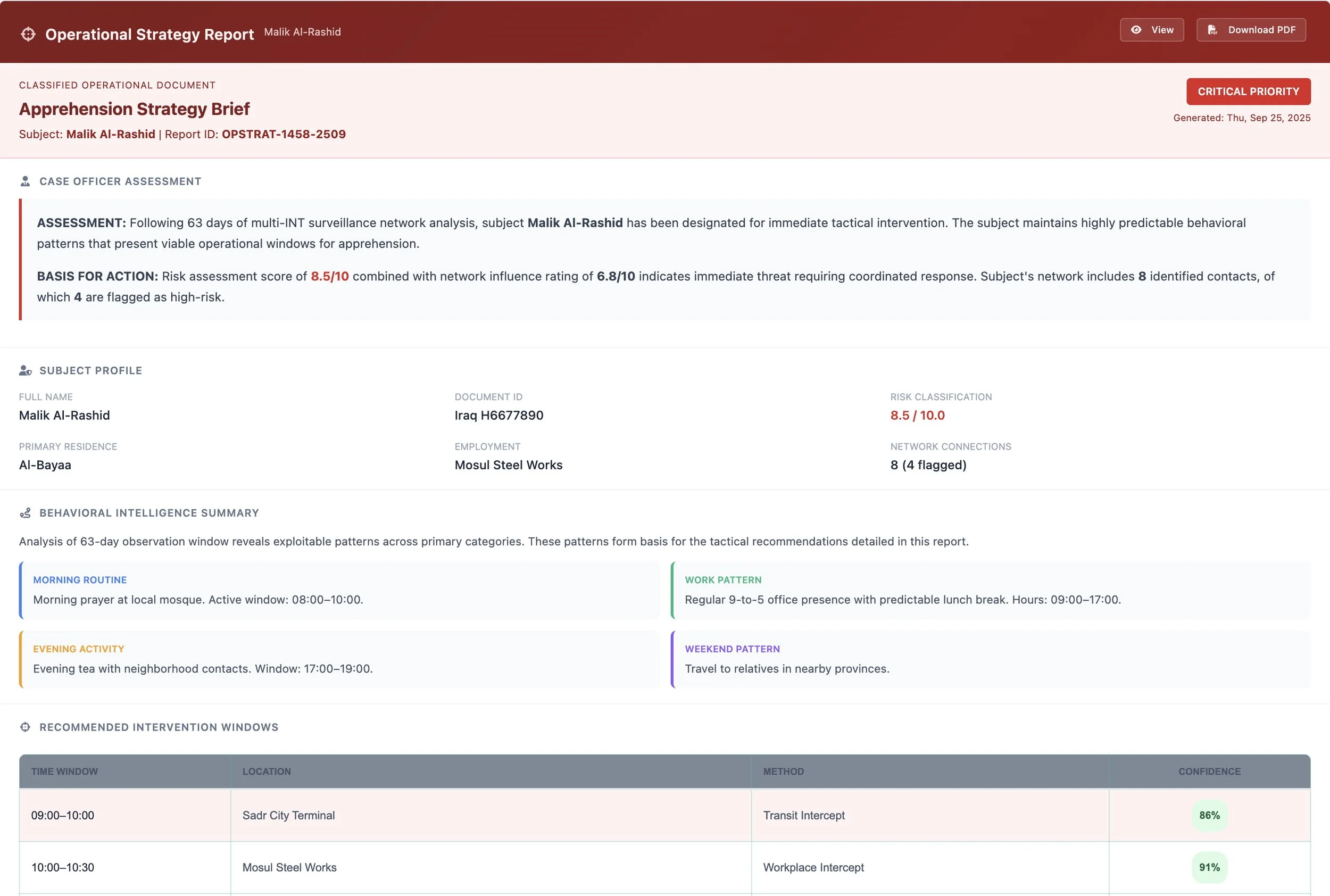 The resulting operational strategy is generated as a structured report, providing officers with AI-assisted recommendations, supporting intelligence, and confidence metrics. This approach transforms fragmented data into actionable insight, supporting informed, timely, and proportionate decision-making in operational environments.
