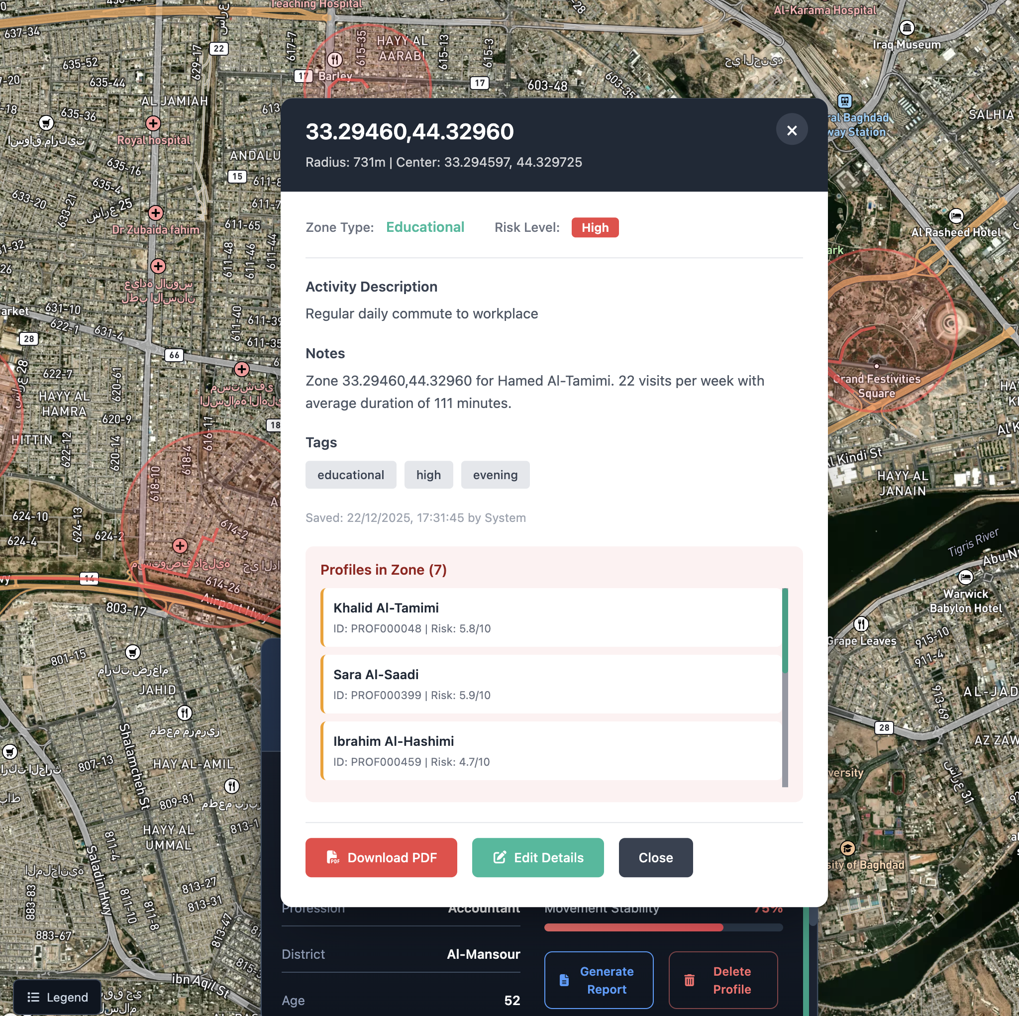 Each zone maintains its own intelligence context, including associated individuals, historical activity, risk indicators, and confidence metrics. Interactive zone cards provide analysts with immediate insight into why a location is significant and how it relates to broader network and behavioral patterns. This enables continuous monitoring, rapid anomaly detection, and proactive response within dynamic operational environments.