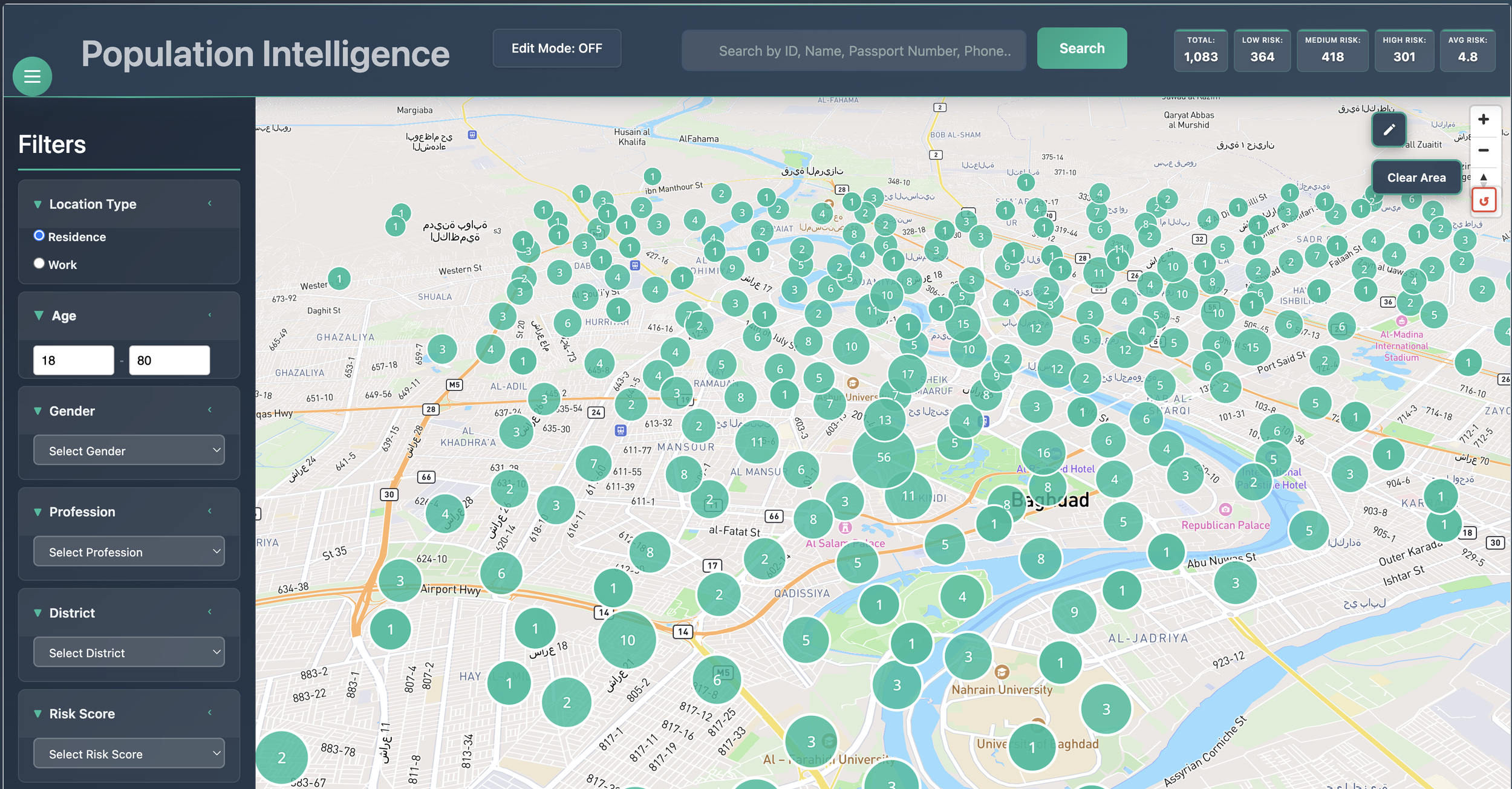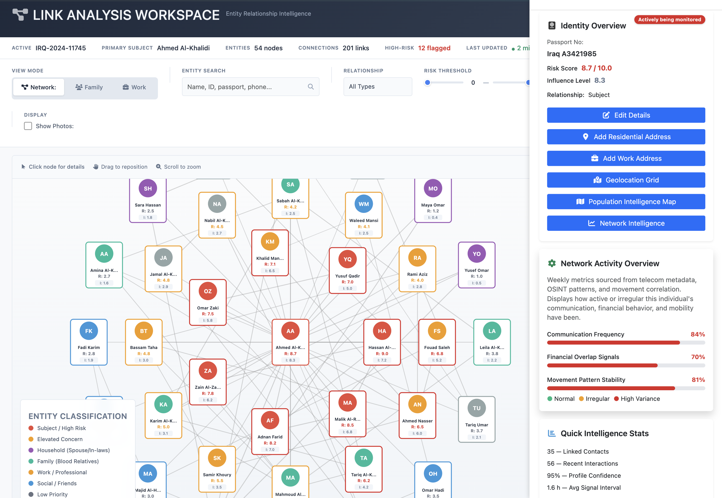 Through an interactive interface, analysts can navigate from high-level population views down to individual profiles, assess risk indicators, review influence and connectivity, and monitor changes over time. Social and relational data is visualised alongside geographic and behavioural context, supporting a deeper understanding of network dynamics and emerging actors.