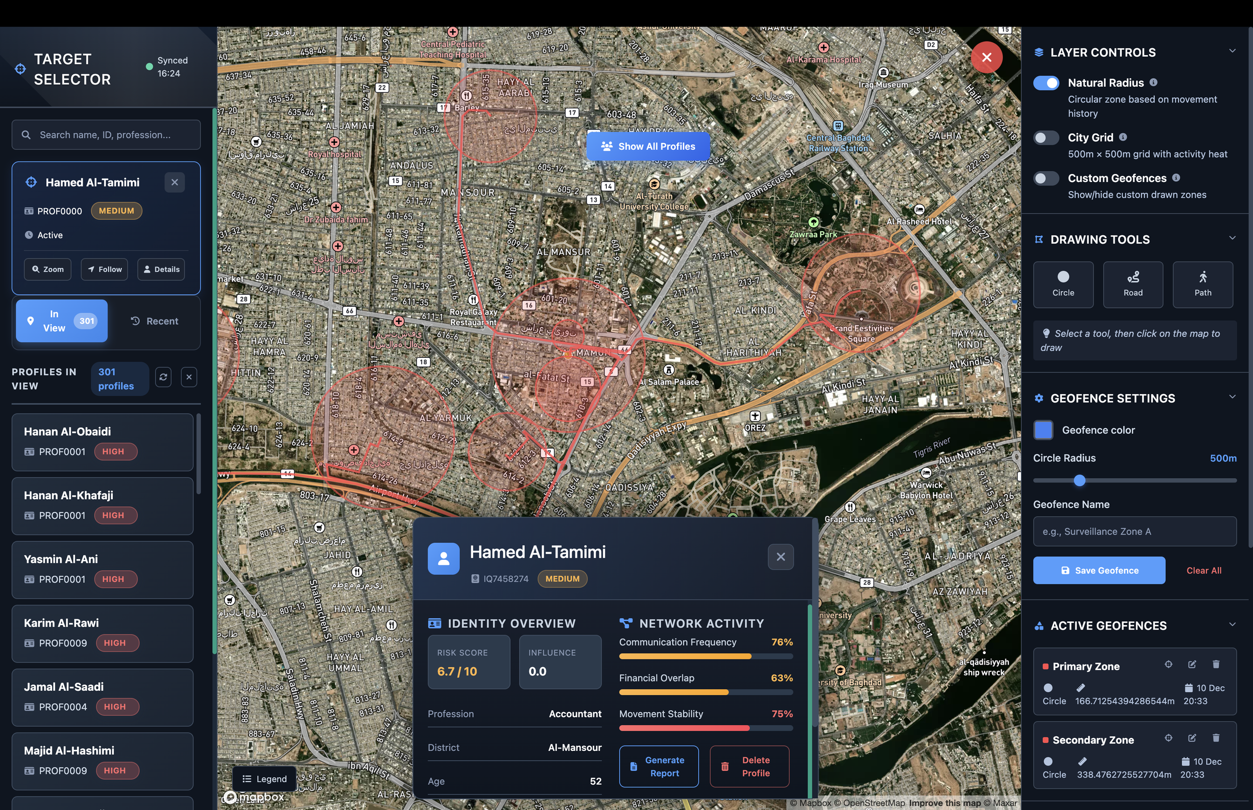 Analysts can define custom geofences manually or leverage AI-assisted automation to generate zones based on observed movement patterns, risk density, or operational relevance. Zones may be classified as monitored, restricted, or sensitive. When an individual enters a restricted or sensitive zone, the system automatically flags the event, records it within the activity log, and generates alerts for review.